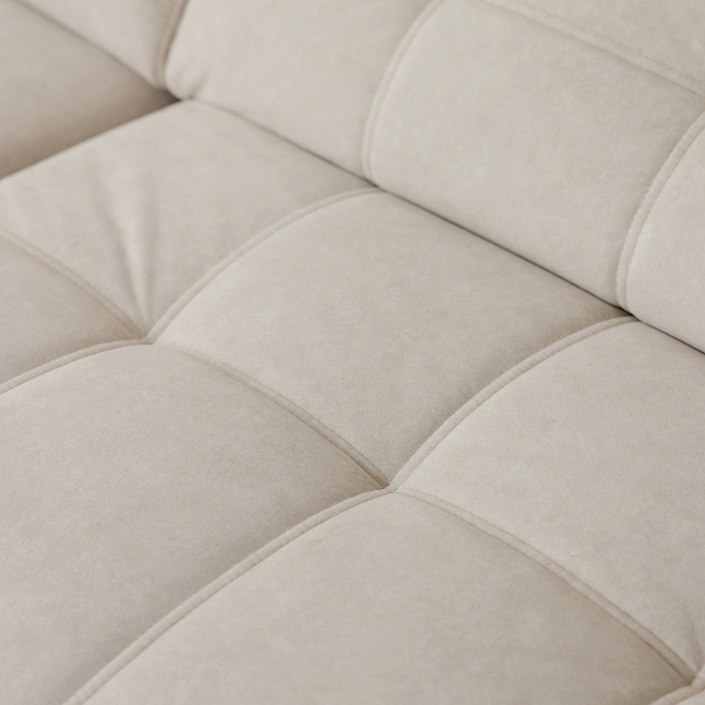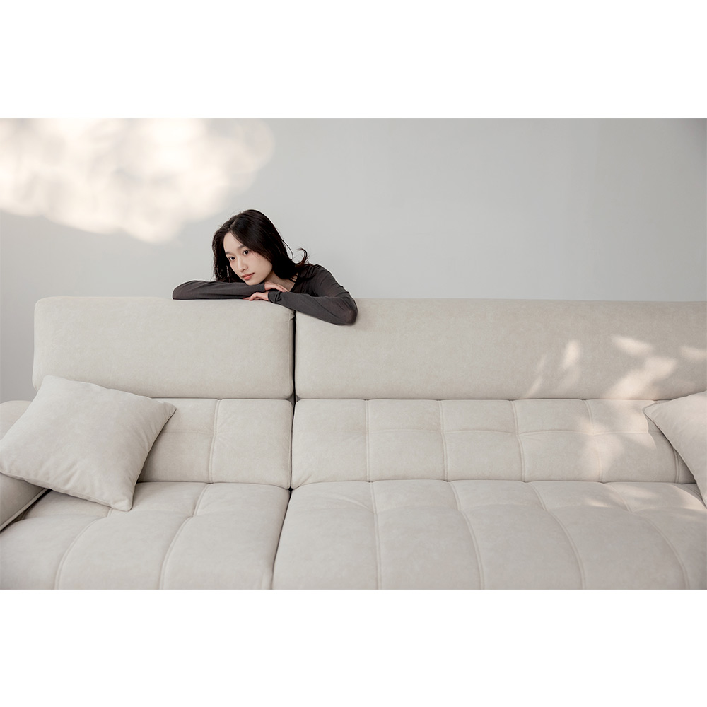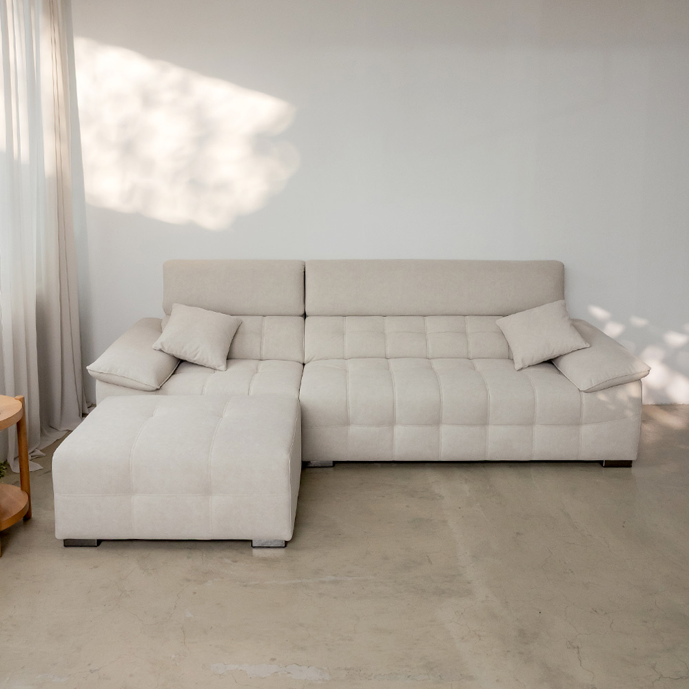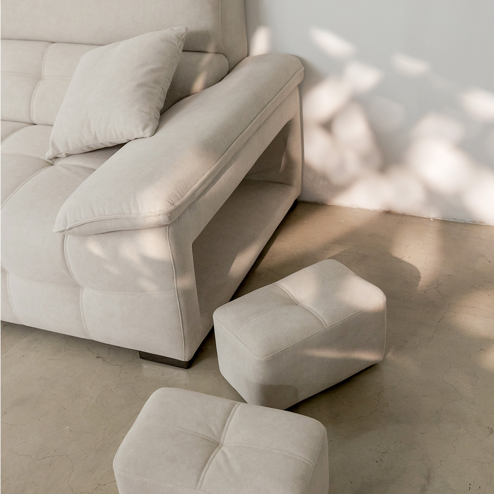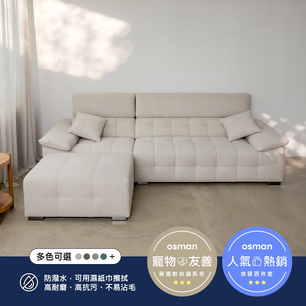 沃野 L 型貓抓布沙發為注重「舒適坐感與實用耐用」的家庭所設計。外觀採簡約現代格紋坐墊與飽滿扶手,視覺溫潤且具有包覆感;座墊採高密度泡綿搭配 S 弹簧支撐,久坐不易塌陷。獨立式小椅凳設計,靈活增加座位或當作腳凳、咖啡桌旁椅使用,增加空間機動性而不占置感。