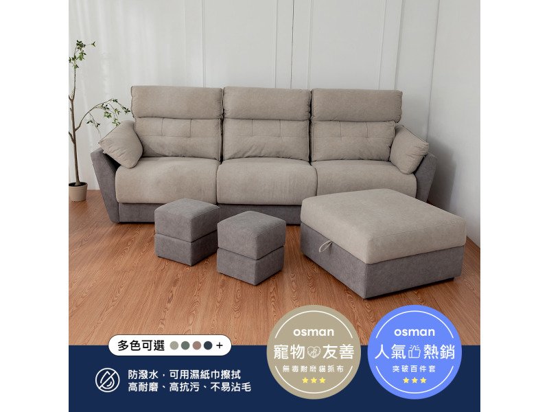 沙發材料: 耐磨貓抓布(可用濕紙巾擦拭,高耐磨、高抗污、不易沾毛) 高密度泡棉、S彈簧、進口皮帶、柳安木、透氣絲棉、時尚沙發腳