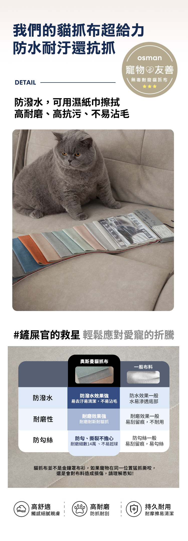 - 貓抓皮(合成皮):耐抓、耐磨、防潑水;清潔容易 → 適合有寵物或想省時保養的家庭。